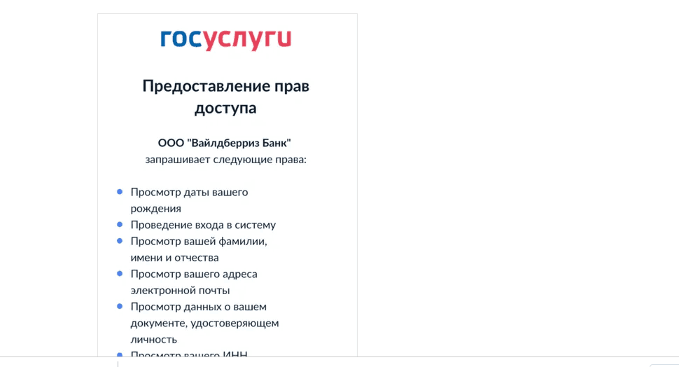Следующий шаг - подтверждение личности для WB. Нужно разрешить доступ "Вайлдберриз Банку" к персональным данным.